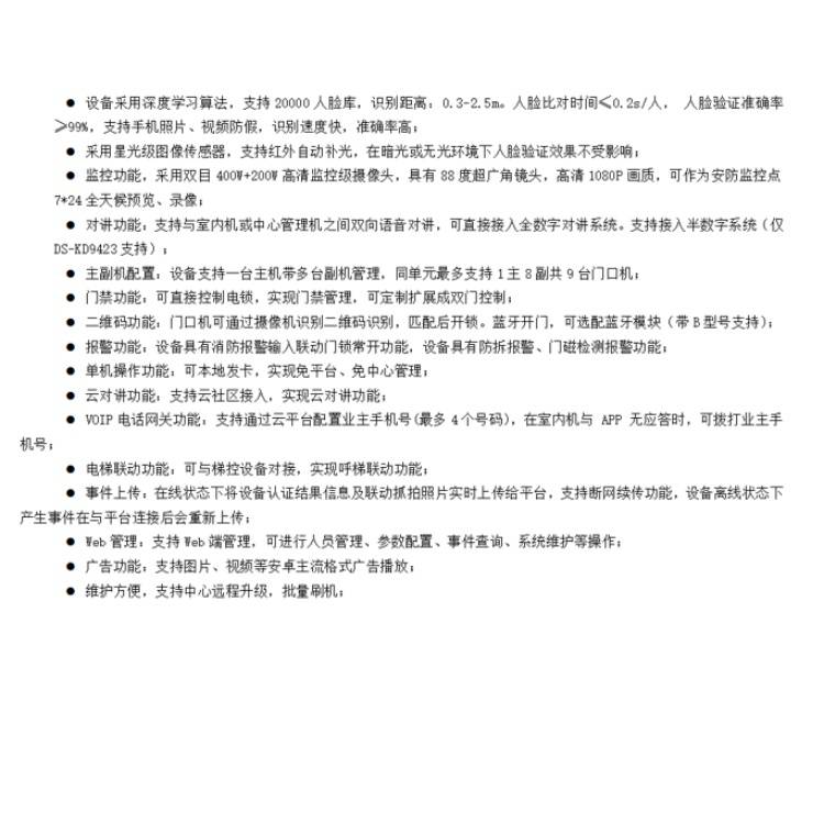 DS-KD9423-BU 海康威视8英寸触摸屏可视对讲安卓人脸门口机 DS-KD9423-G DS-KD9423-WB 功能特性: