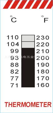 测温纸国内外有不同的叫法,俗称变色示温片,示温片,表面温度签,示温纸,感温纸,温敏试纸,温度纸,示温蜡片,热敏纸,温度试纸等等。是一种用于测温的胶条,可粘贴在所测物体的表面,当到达所测温度时,测温条中间的小方格会通过颜色的变化来显示温度。在小型贴纸上有一列方格或圆点﹐代表不同的温度值﹐当温度上升至该温度点时﹐方格会转变成黑色﹐温度降低后也不会回复到原来的颜色﹐这样便可知道物体曾经历过的温度﹐以及是否有超温现象。