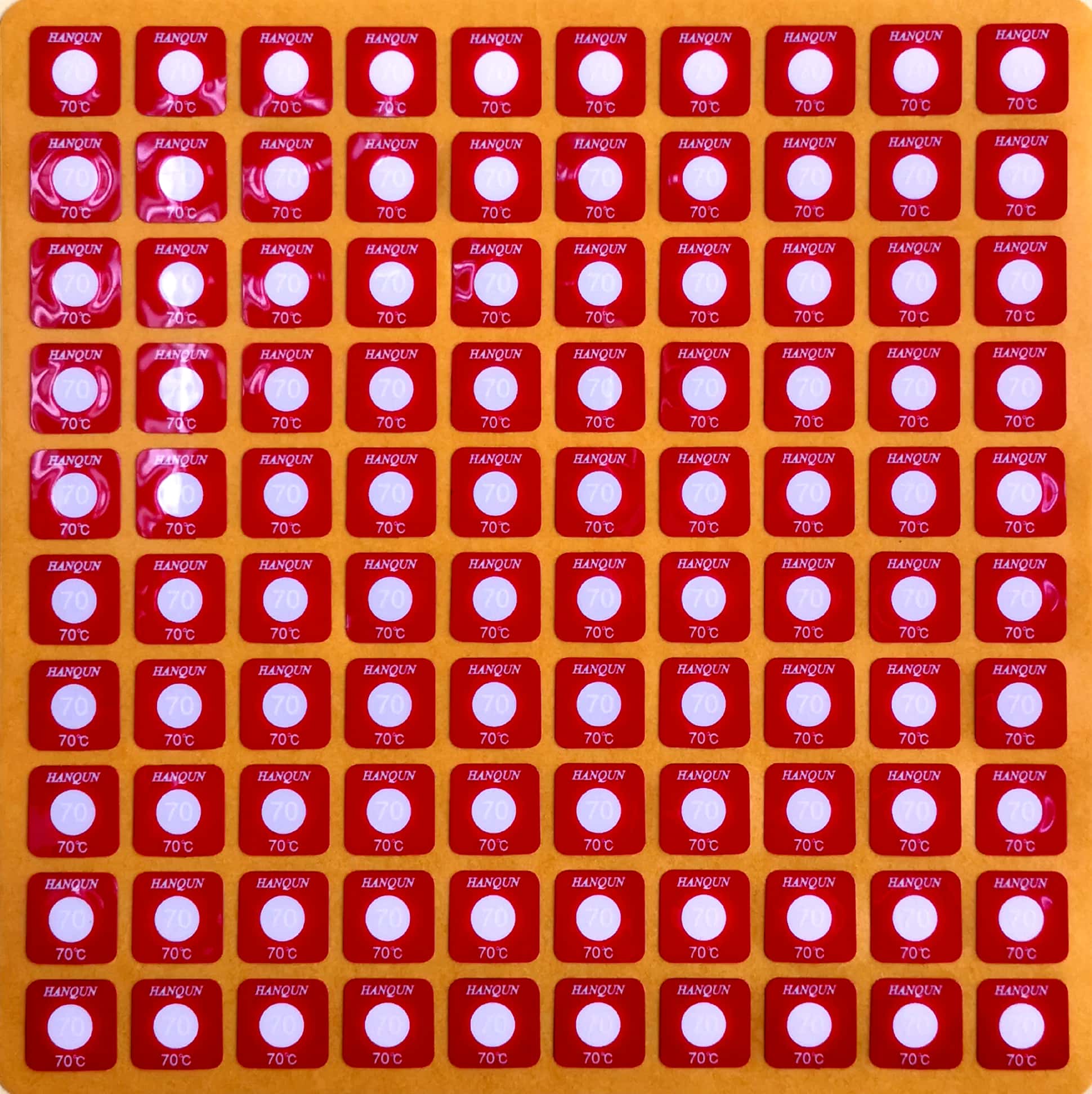 2.使用时如要知道监测部位温度逐渐上升的情况,可粘贴两片以上不同额定温度的变色测温贴片,亦可使用多个温度组合型等贴片(每片中含多种额定温度)。
