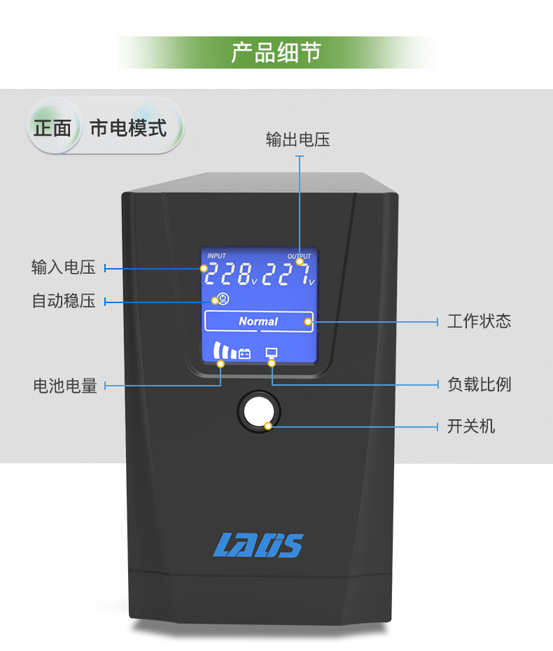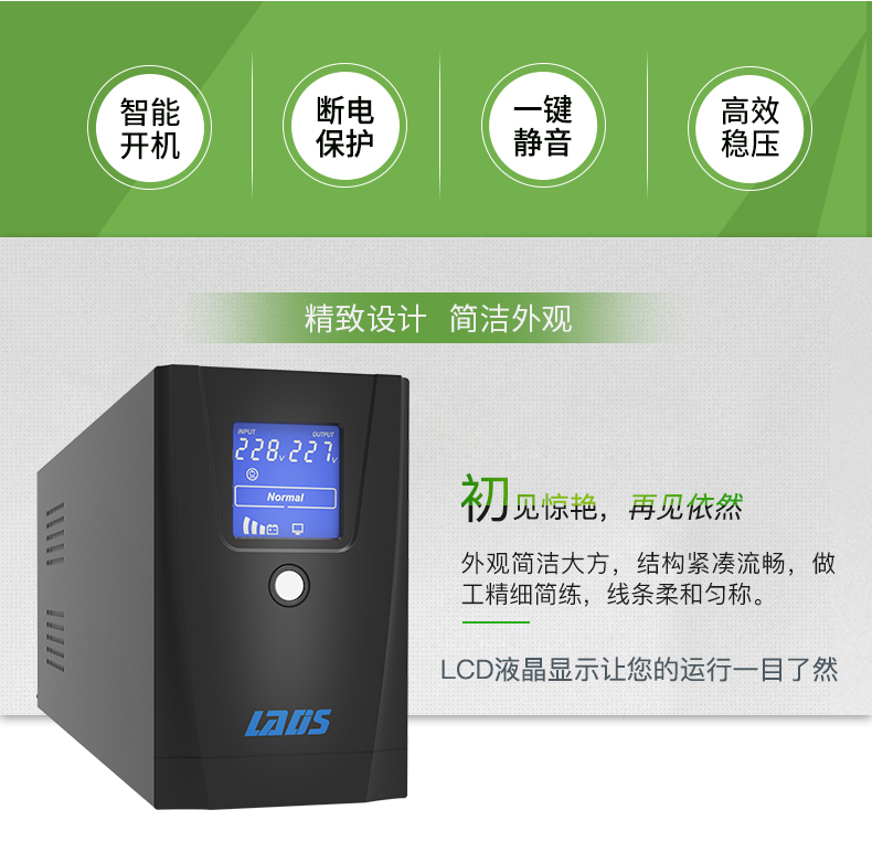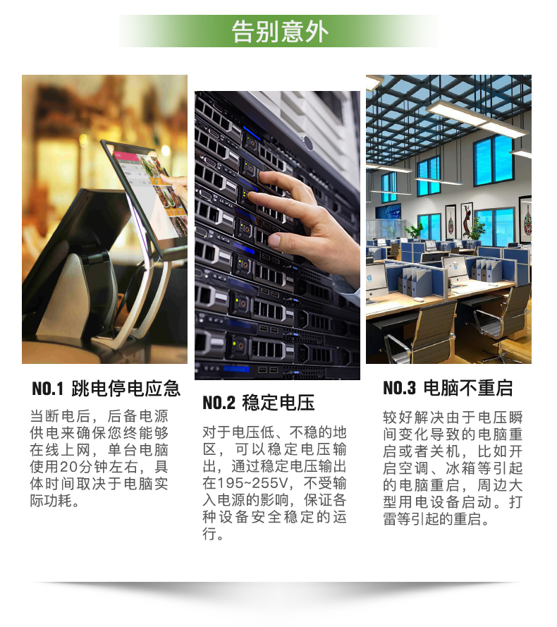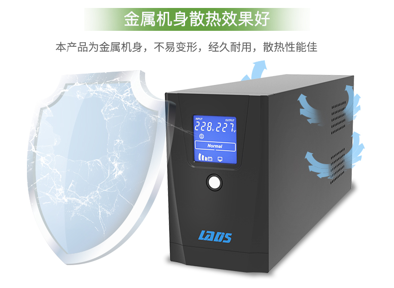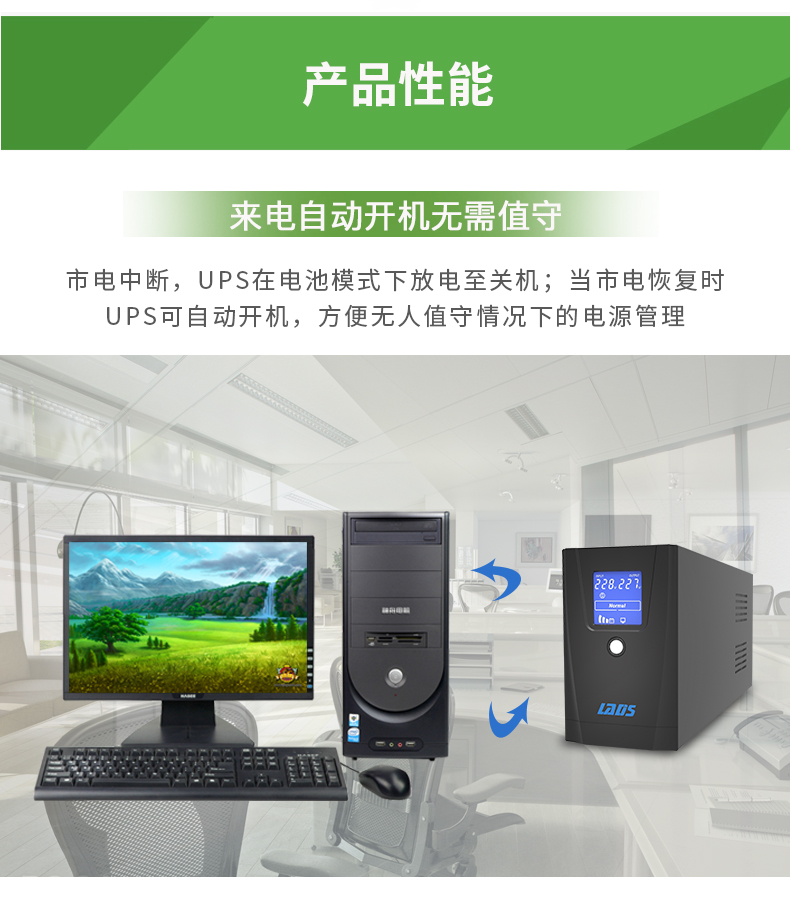 目前在市场上可以购买到种类繁多的UPS电源设备,其输出功率从500VA到3000kVA不等。当有市电供给UPS的时候,UPS对市电进行稳压(220V±5%)后为计算机供电。此时的UPS就是一台交流市电稳压器,同时它还向机内电池充电。因UPS设计的不同,UPS适应的范围也不同,UPS输出电压在±10-15%的变化一般属正常的计算机使用电压。当市电异常或者中断时,UPS立即将机内电池的电能通过逆变转换供给计算机系统,以维持计算机系统的正常工作并保护计算机的软硬件不受损失。