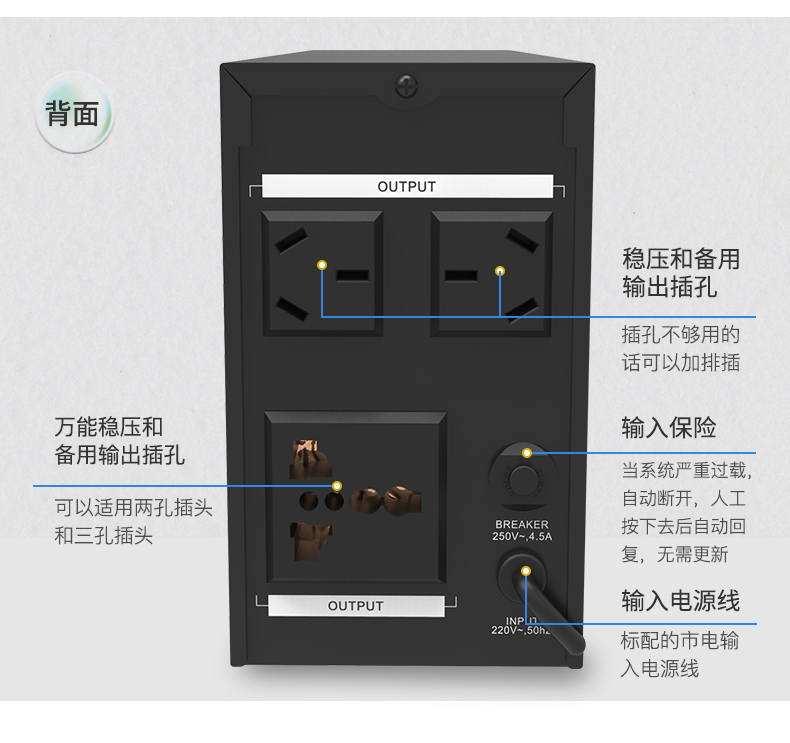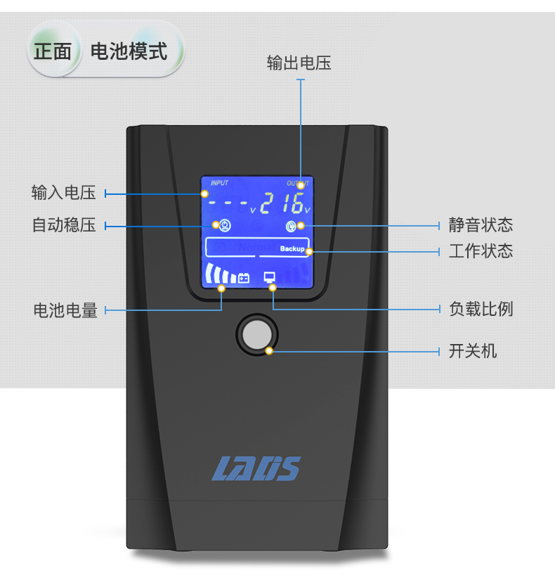 UPS(Uninterruptible Power System ),即不间断电源,是一种含有储能装置,以逆变器为主要组成部分的恒压恒频的不间断电源。主要用于给单台计算机、计算机网络系统或其它电力电子设备提供不间断的电力供应。当市电输入正常时,UPS 将市电稳压后供应给负载使用,此时的UPS就是一台交流市电稳压器,同时它还向机内电池充电;当市电中断(事故停电)时, UPS 立即将机内电池的电能,通过逆变转换的方法向负载继续供应220V交流电,使负载维持正常工作并保护负载软、硬件不受损坏。