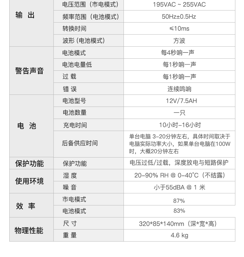 标准的UPS未加外接电池前,在它的输出功率与负载耗电功率完全匹配(即全负载)的情况下,一般从市电中断时算起可供电约6-10分钟(具体数值每个型号的UPS说明书上都有记载)。如果以负载耗电功率只有UPS输出功率的一半计算(习惯叫半负载或者50%负载率,如1000W的UPS接入500W的负载),则可供电12-25分钟,不同负载量时的UPS供电时间大约可参照负载减半时间加倍的方式计算。使用注意事项正确使用UPS电源,不但可以减少UPS发生故障的机会,而且能够有效地延长其使用寿命。